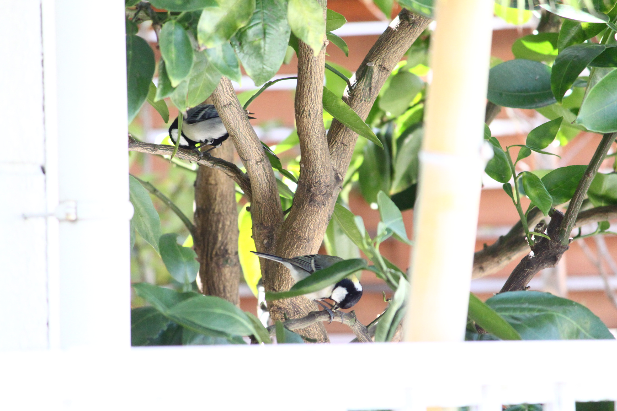 裏庭のデッキの横にある、おばけゆずの木の中が何やら白黒の小さいのが動いてるw