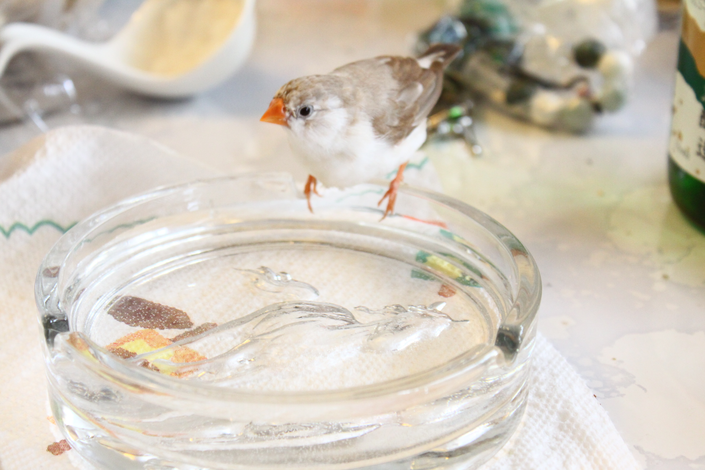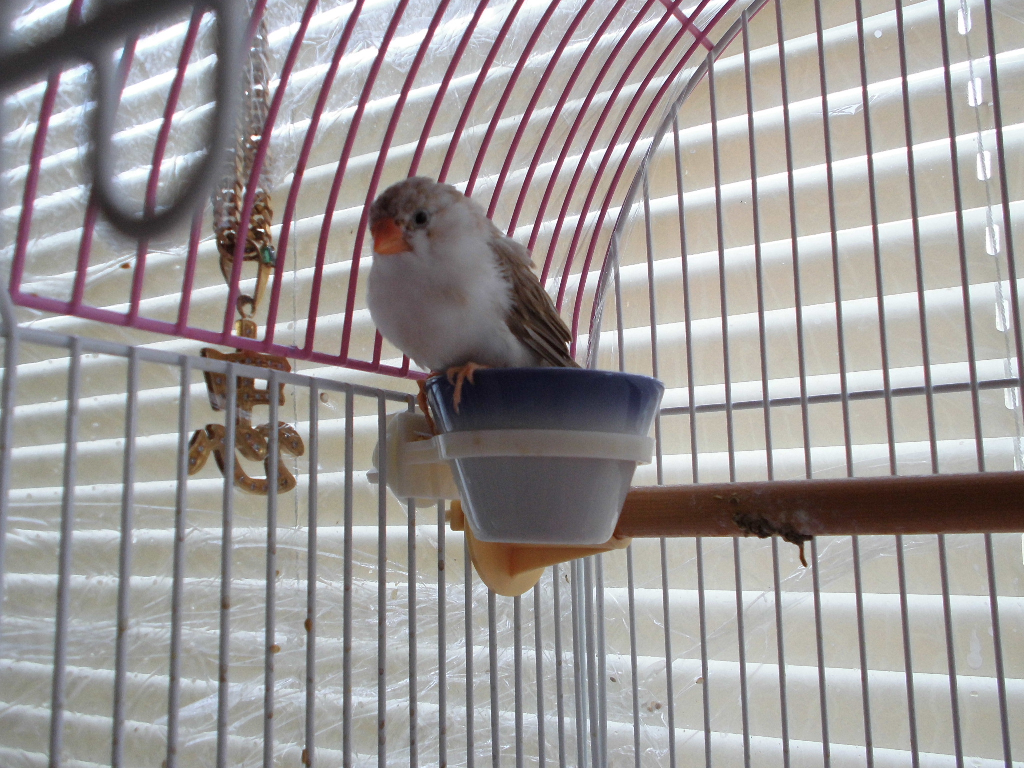 今朝は、ケージから出せ!出せ!ダンスをして出したら、灰皿プールで水浴びして、旦那のパジャマの腕に乗って、肩まで上がって、しばしボーーーっとして、自らケージに入っていったみたいw